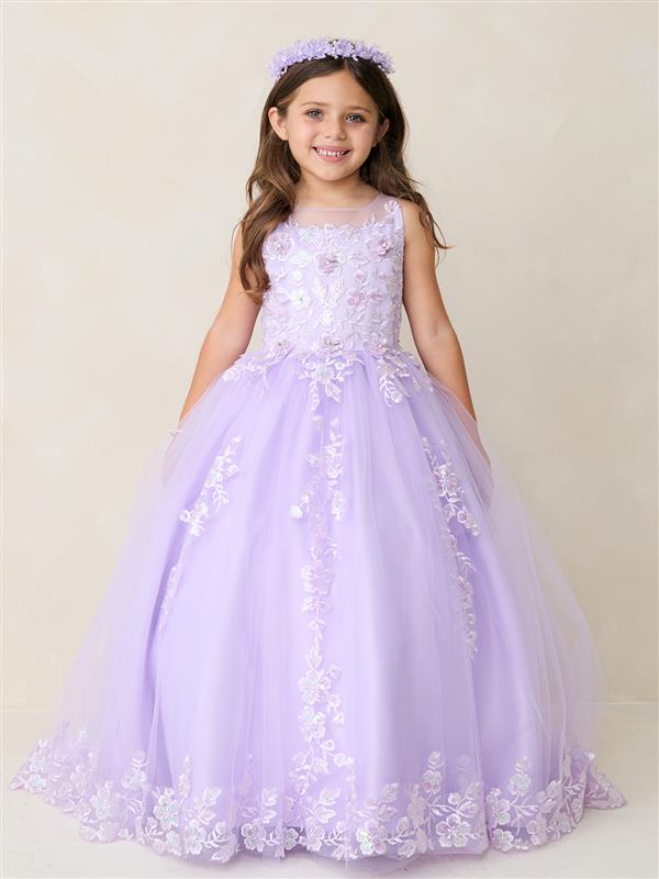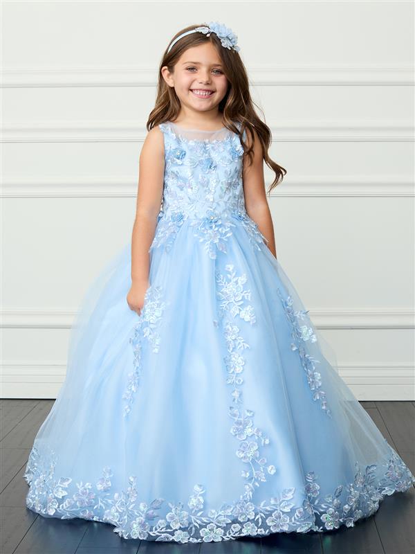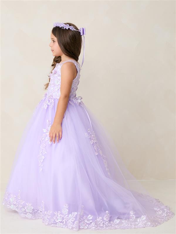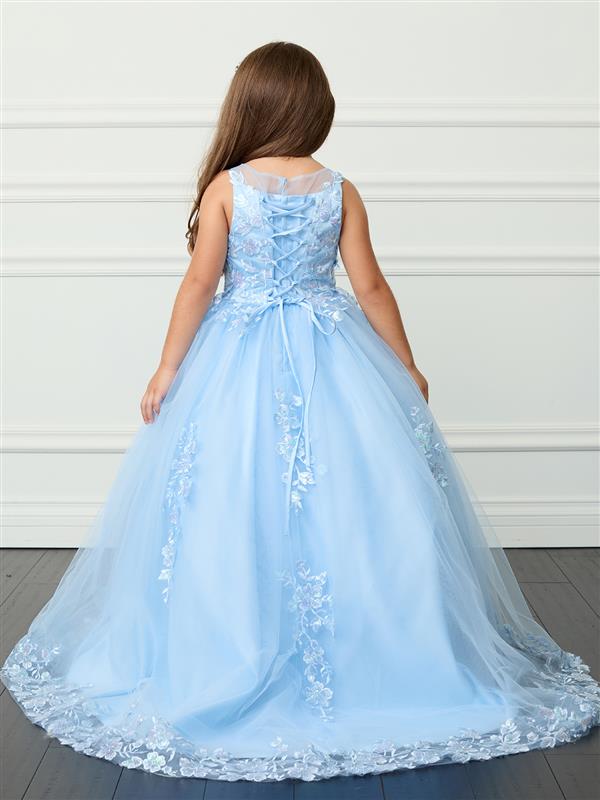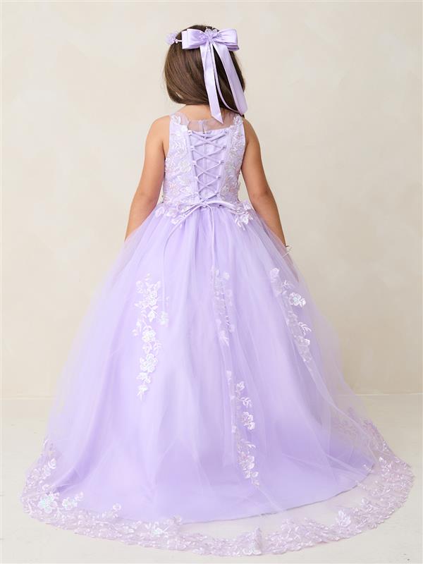 Illusion Neckline Neckline with Irridescent Lace Applique with a Long Tail